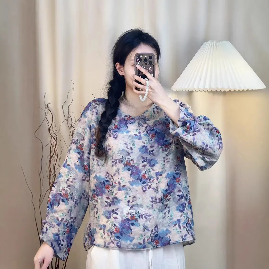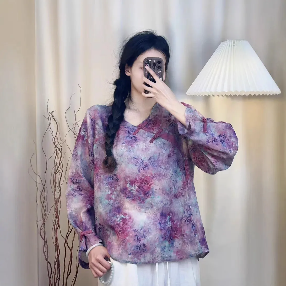 衣都精品- 新款印花V領盤扣寬鬆套頭上衣
