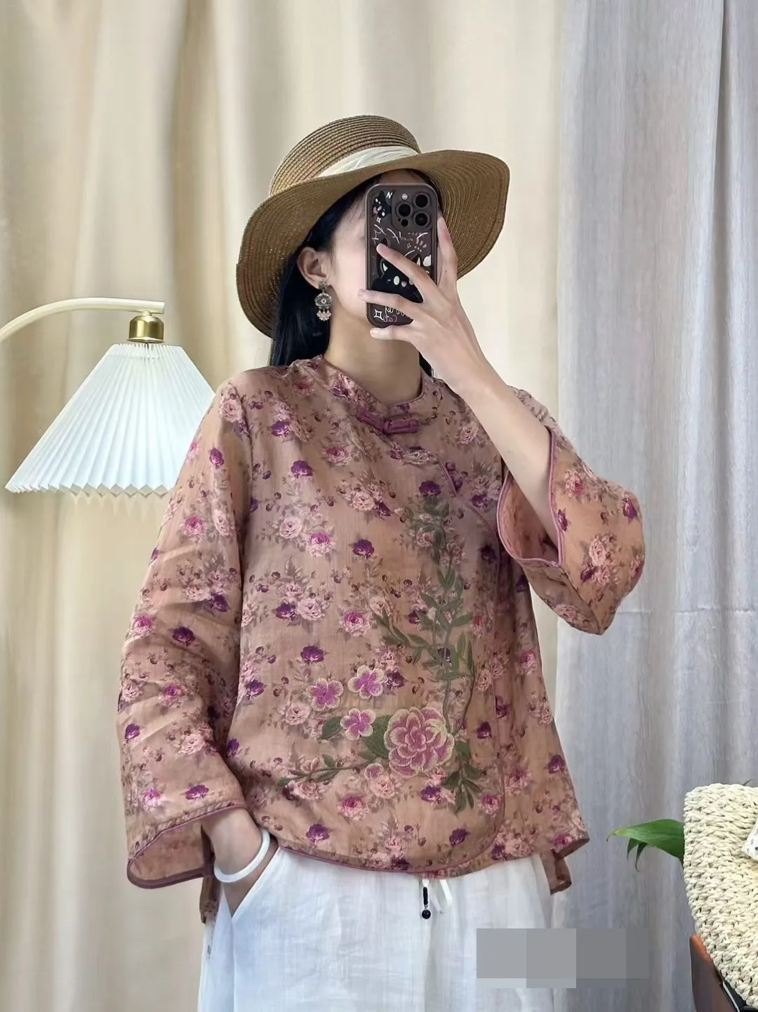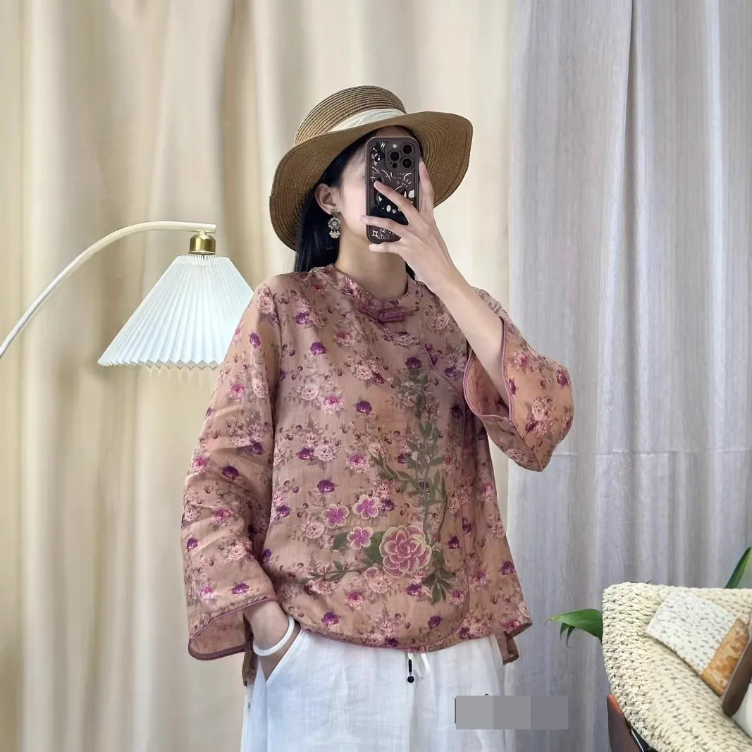 衣都精品- 新款文藝風圓領印花刺繡斜襟盤扣上衣