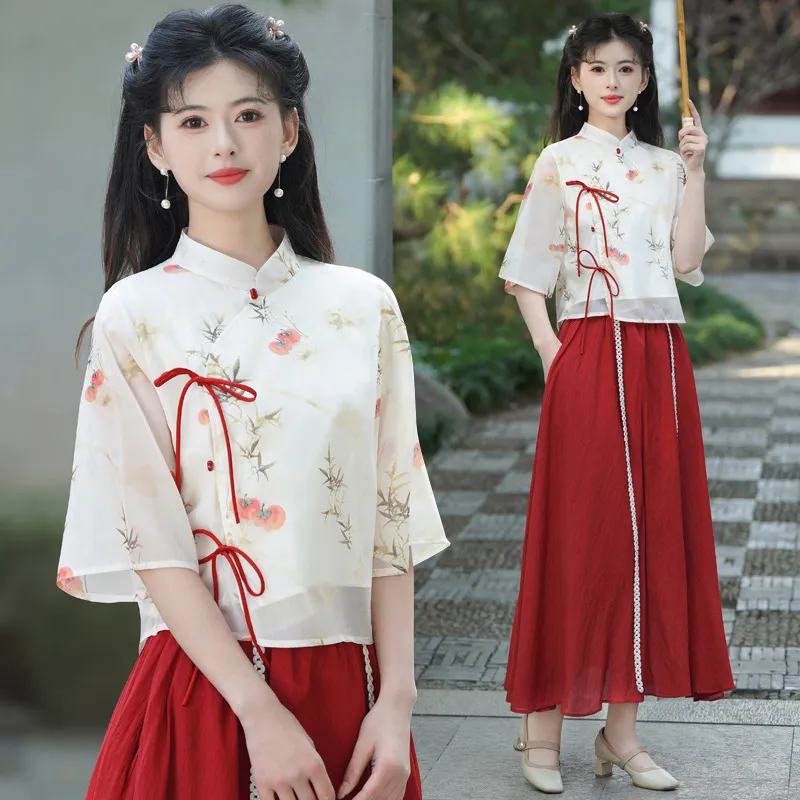 衣都精品- 新款中國風改良旗袍印花繫帶上衣