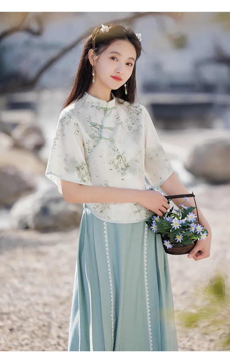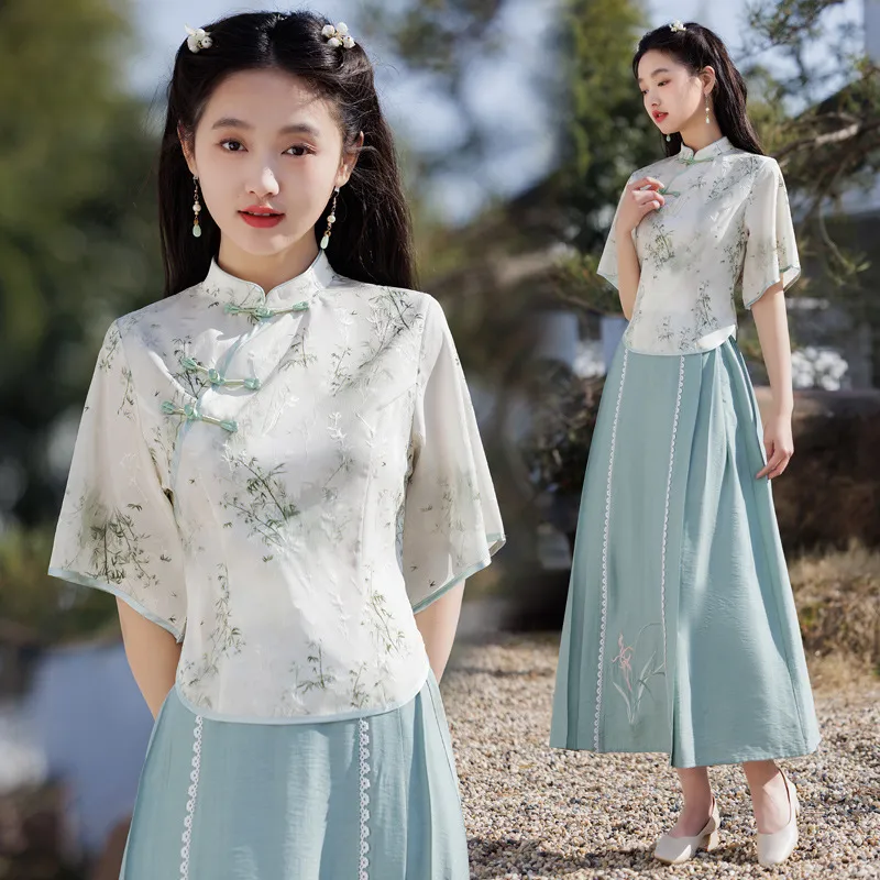 衣都精品- 新款中國風改良旗袍印花繫帶上衣