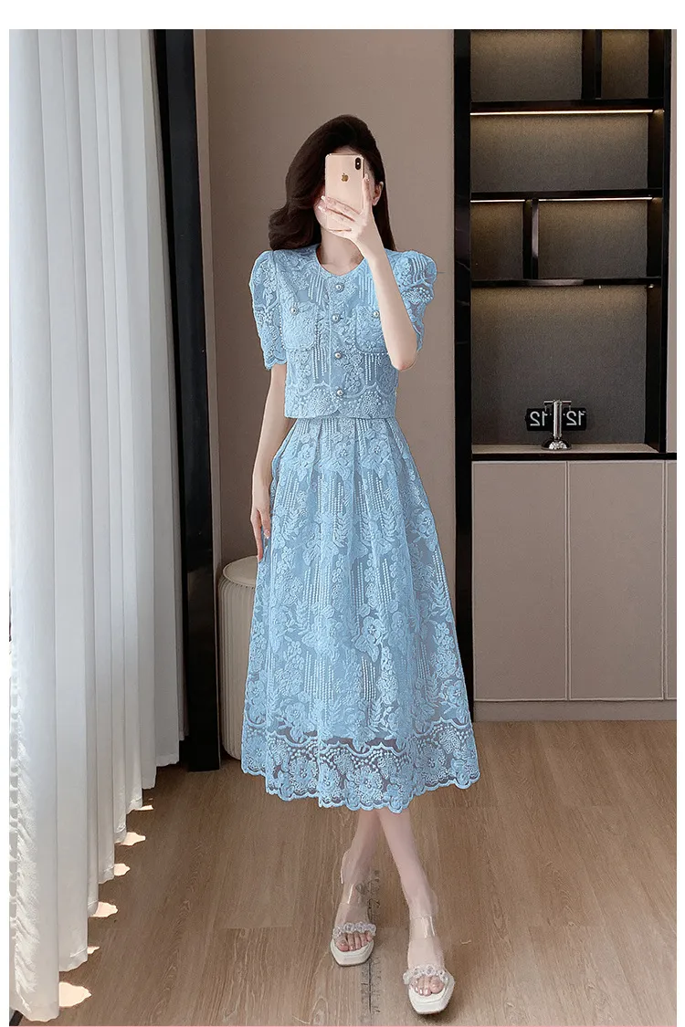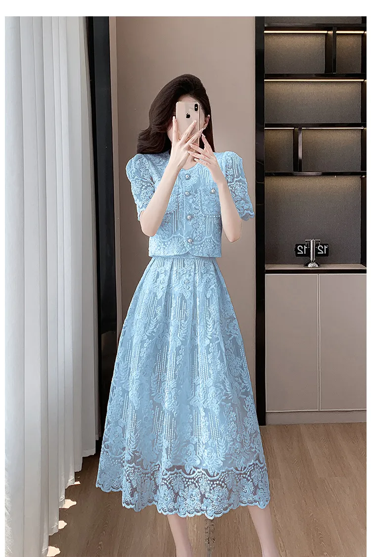 衣都精品- 新款小香風釘珠蕾絲短款上衣+半身裙