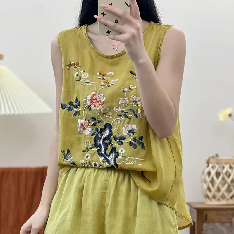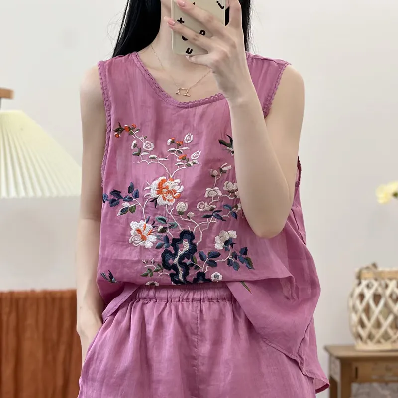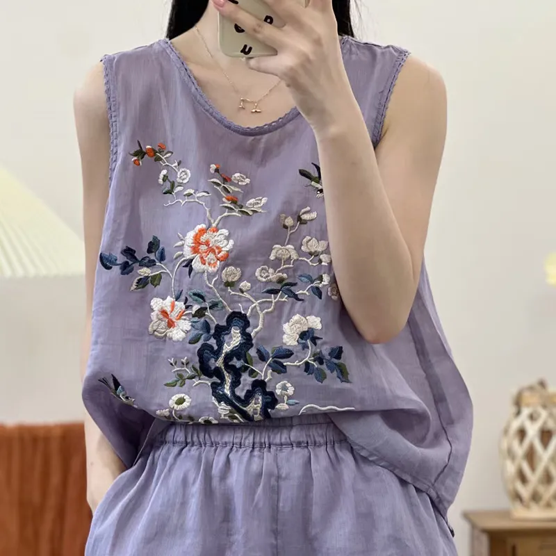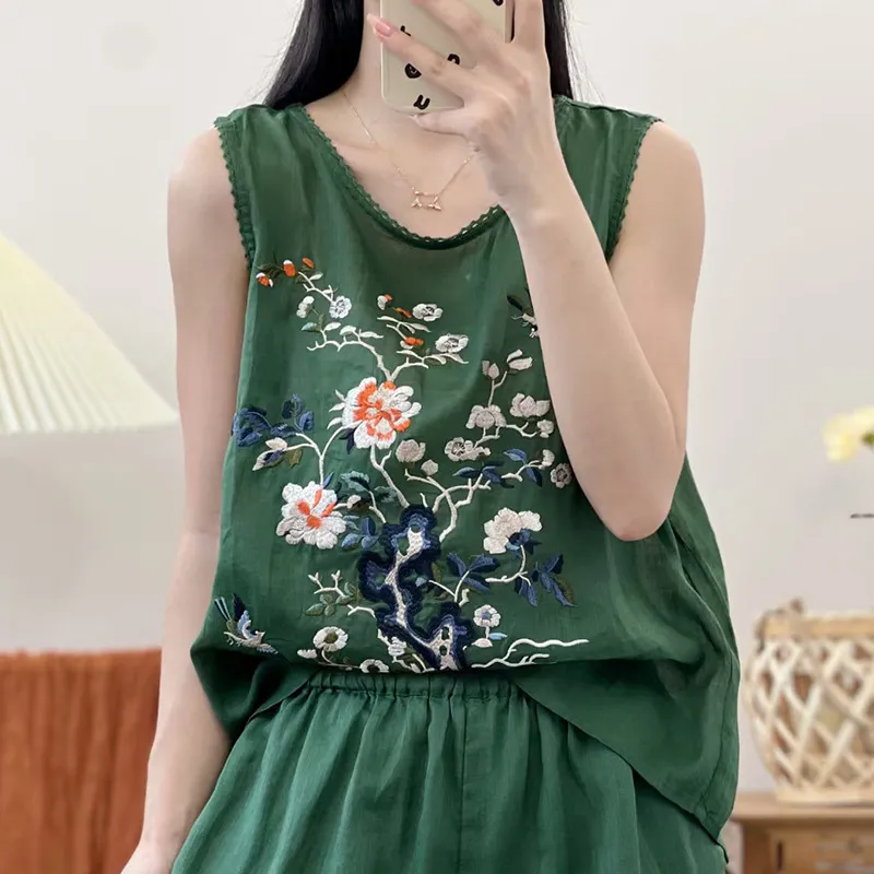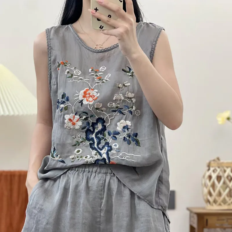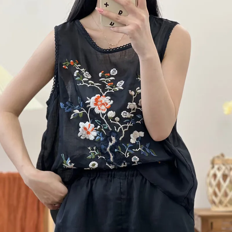 衣都精品- 新款無袖圓領純色刺繡背心上衣