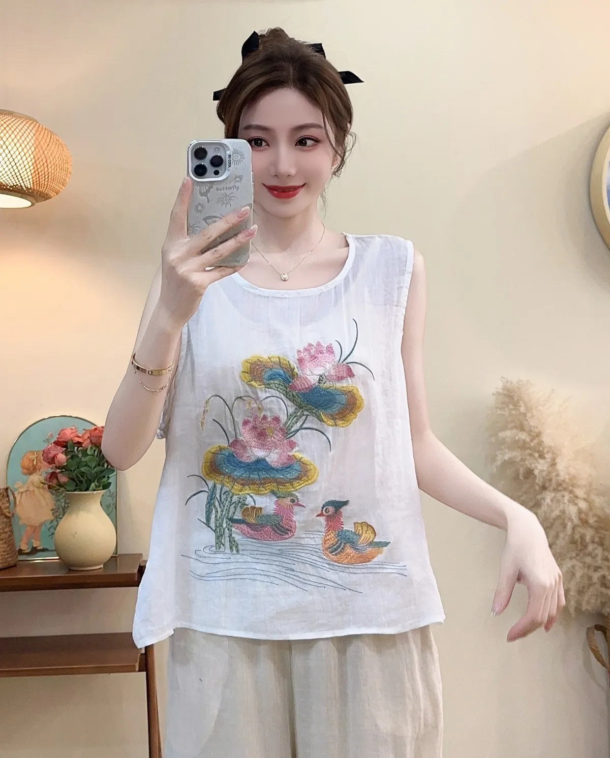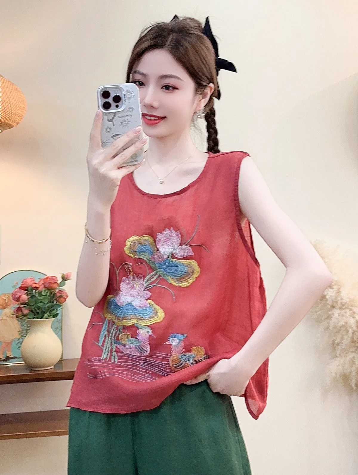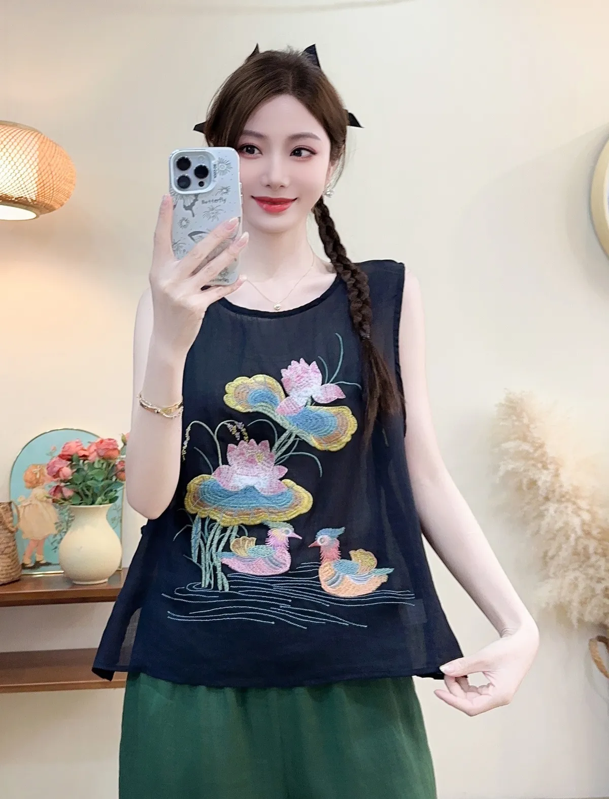 衣都精品- 新款文藝圓領重工刺繡背心上衣