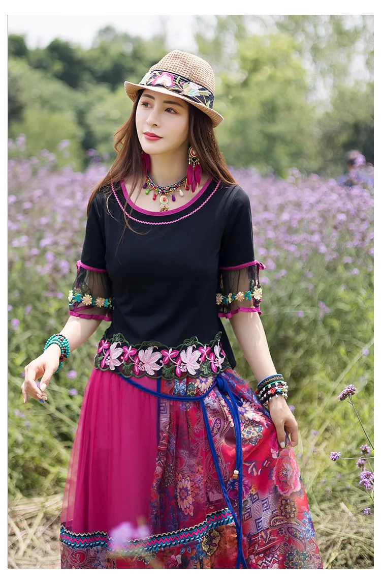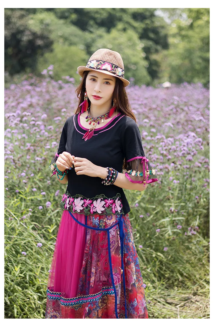 衣都精品- 新款民族風圓領刺繡花莫代爾網紗上衣