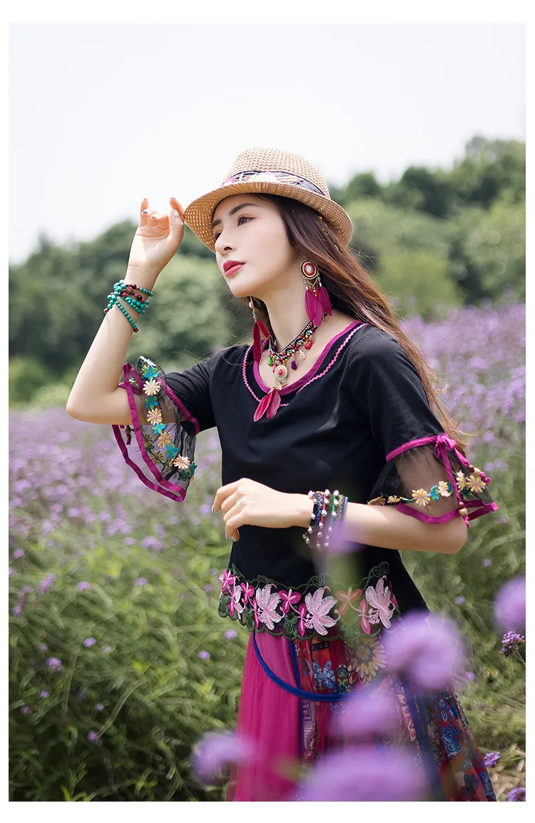 衣都精品- 新款民族風繡花圓領拼接五分喇叭袖上衣
