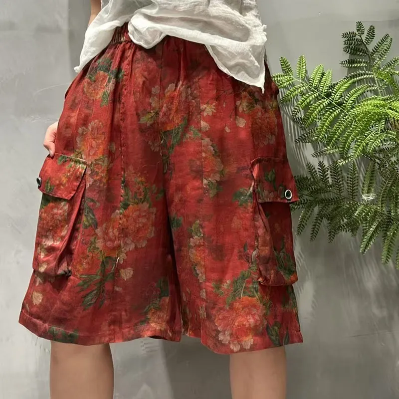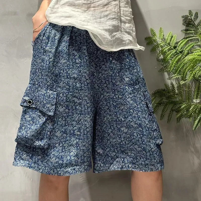衣都精品- 新款鬆緊腰寬鬆顯瘦雙層苧麻五分褲
