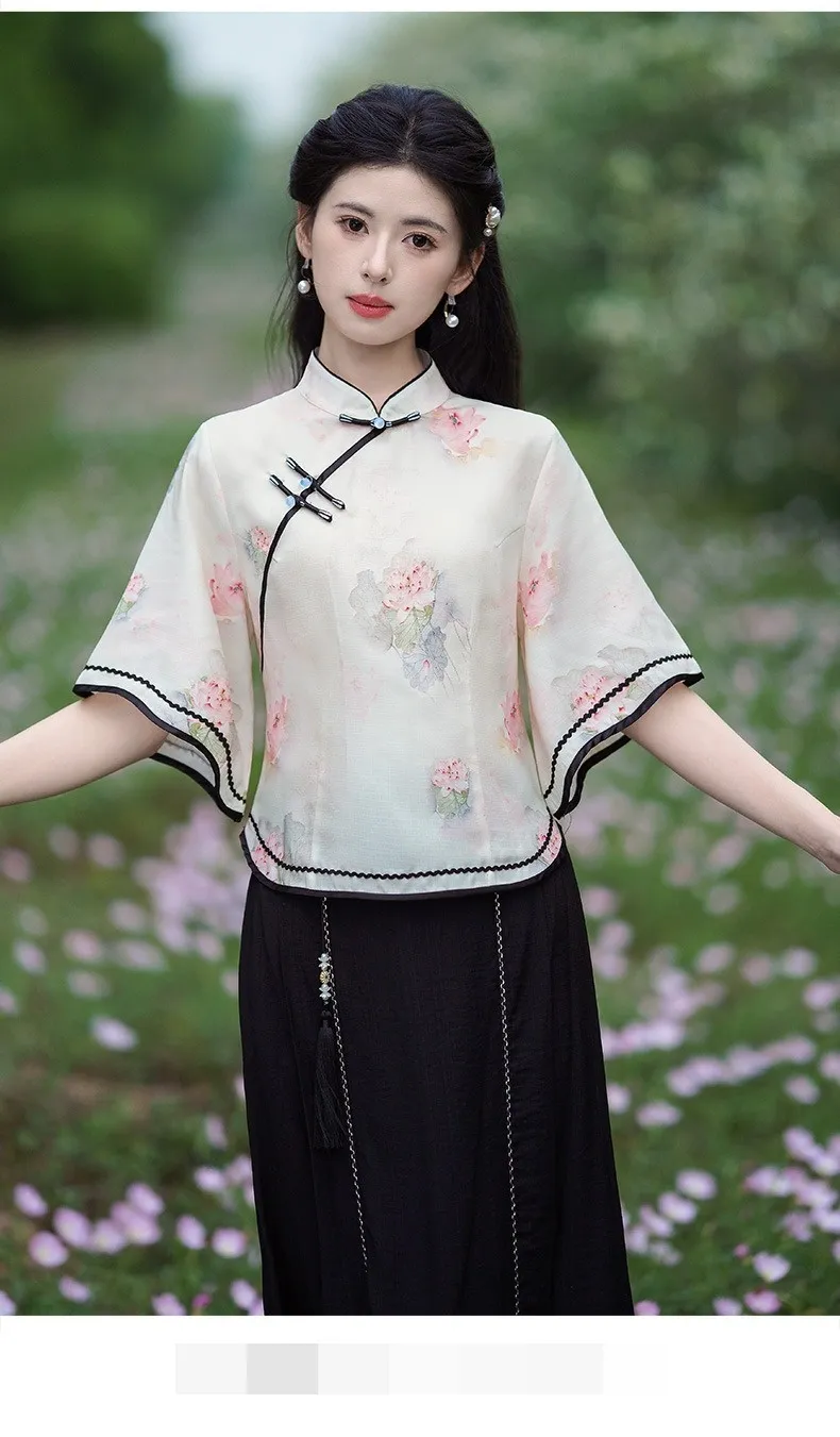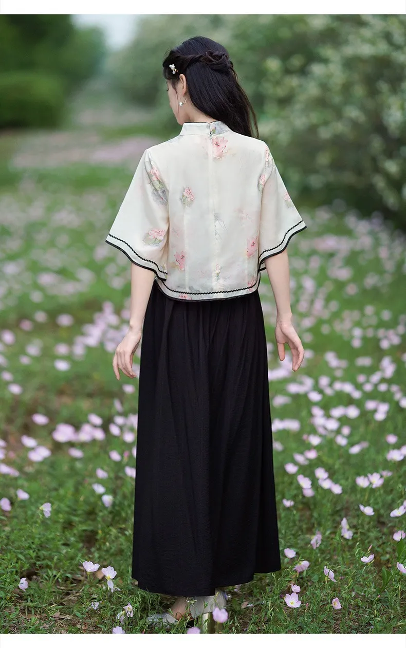 衣都精品- 新款中式清蓮印花立領盤扣改良上衣+半身裙兩件式套裝