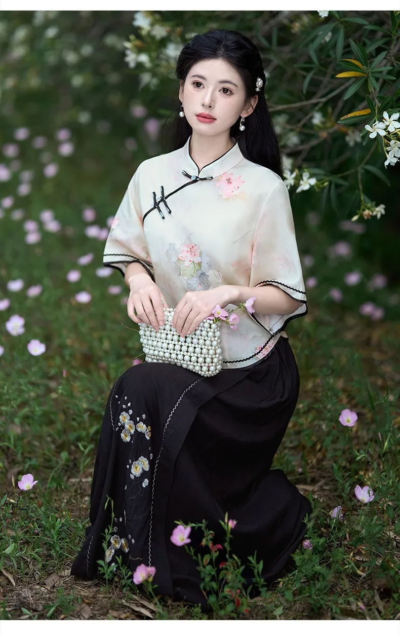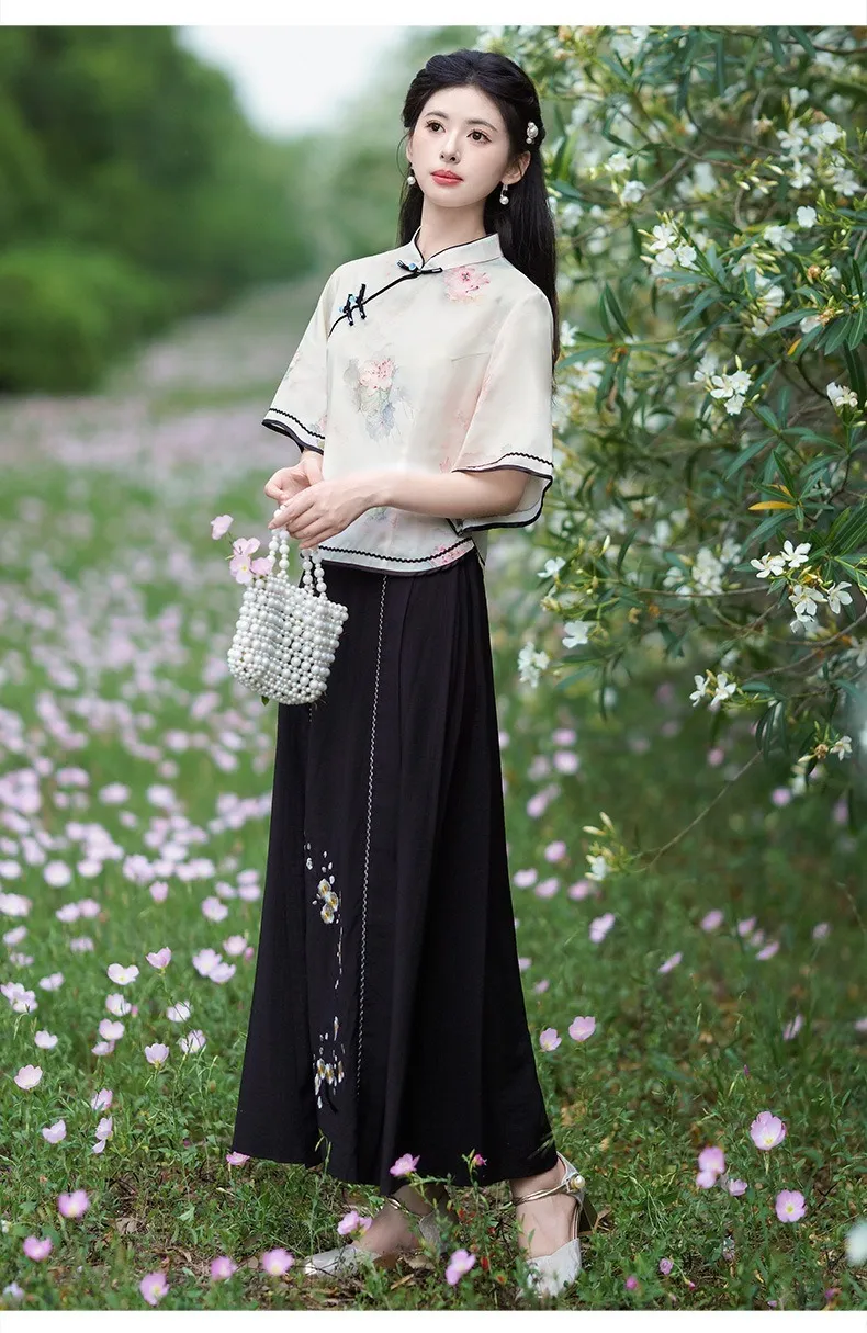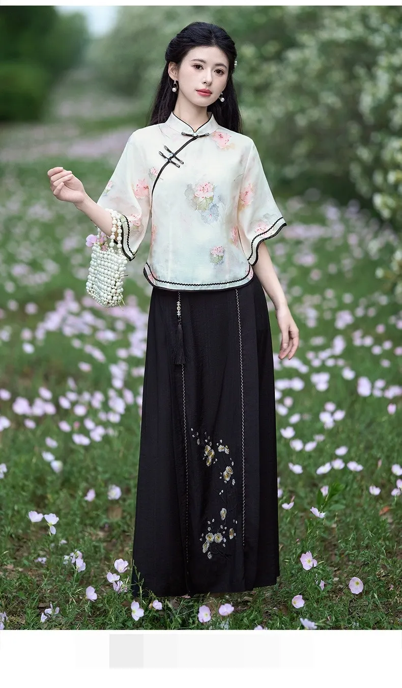 衣都精品- 新款中式漢服立領珠子盤扣重工刺繡上衣+半身裙兩件式套裝
