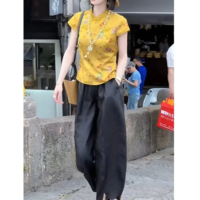衣都精品- 新款中國風玫紅色印花上衣+闊腿褲兩件式套裝
