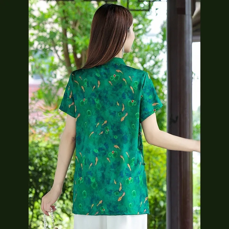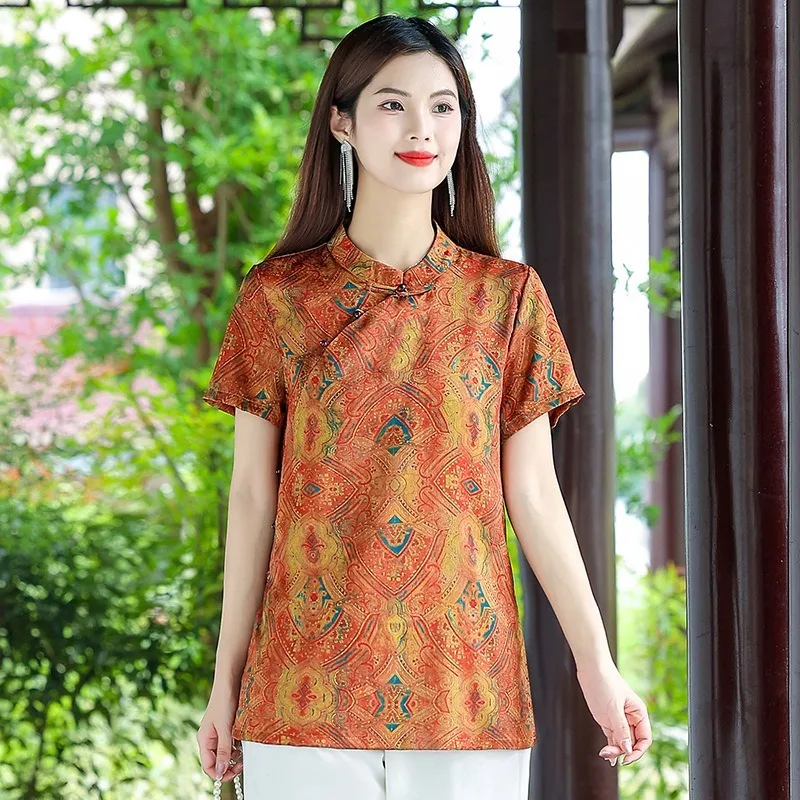 衣都精品- 新款中國風橘色提花短袖桑蠶絲上衣