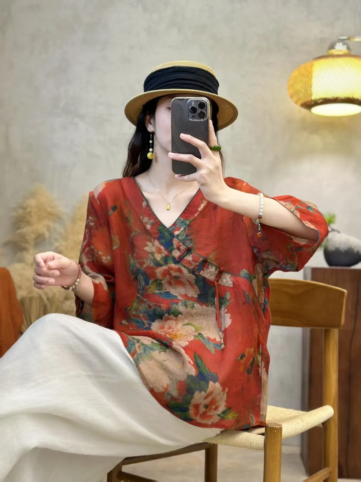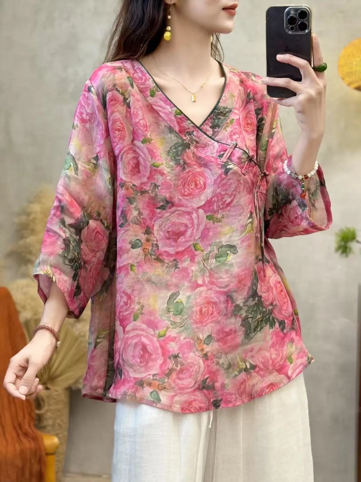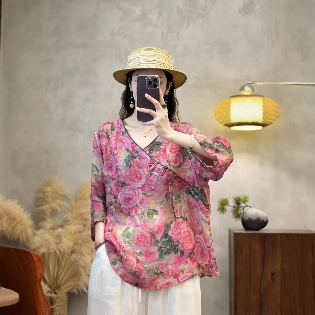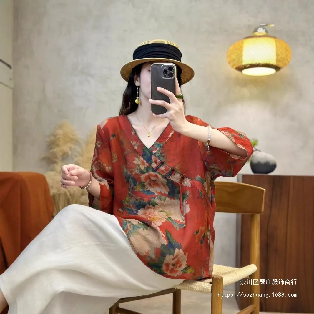 衣都精品- 新款中國風V領斜襟數位印花上衣