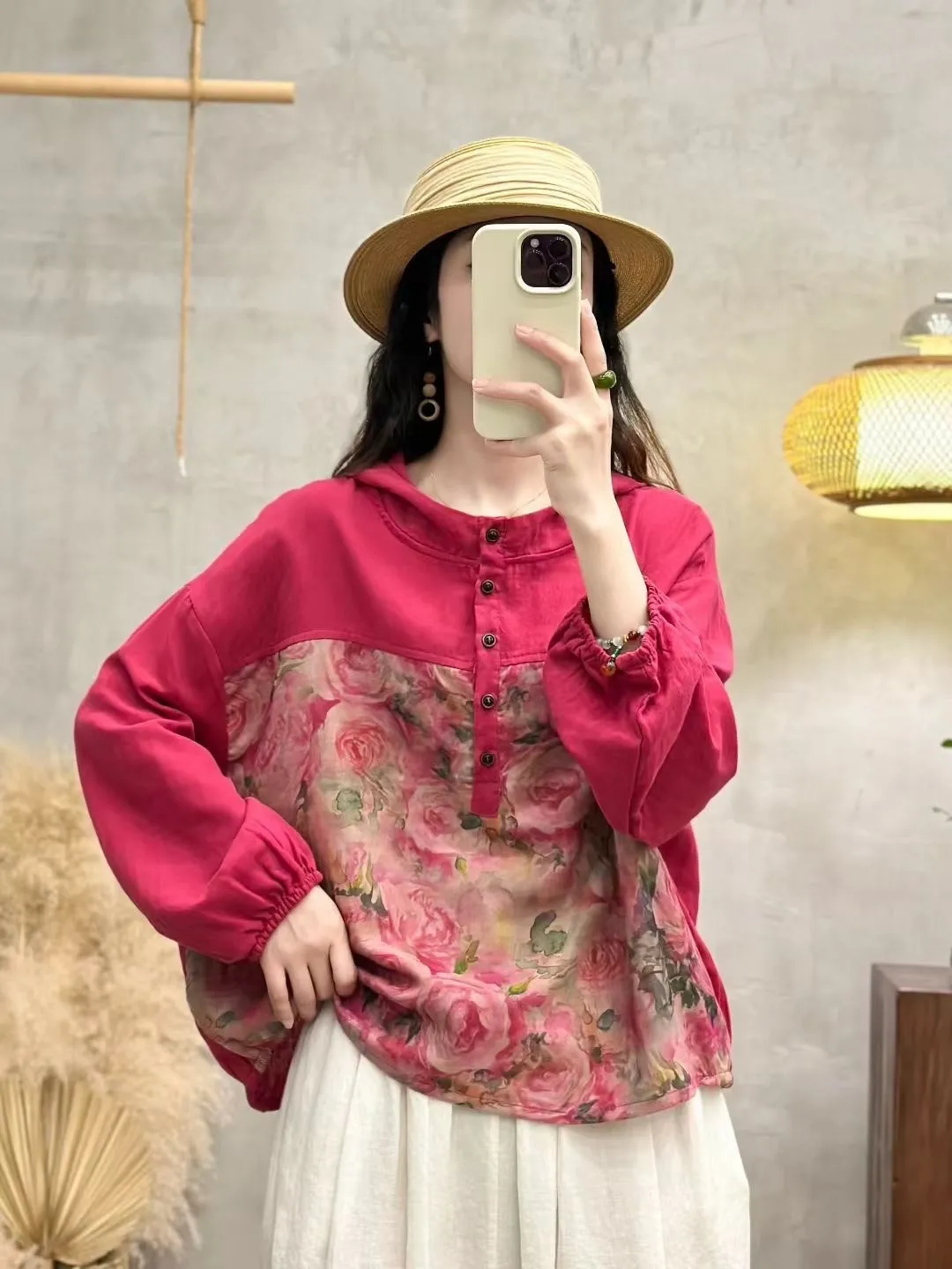 衣都精品- 新款顯瘦撞色印花連帽雙層紗上衣