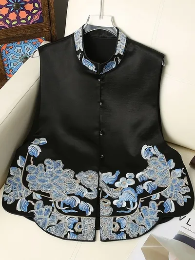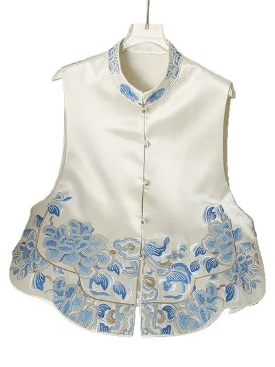 衣都精品- 新款青花瓷復古立領珠扣緞面馬甲外套