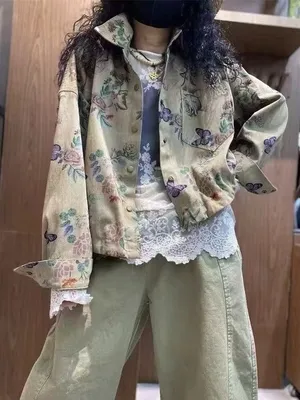 衣都精品- 新款簡約翻領單排扣印花牛仔外套