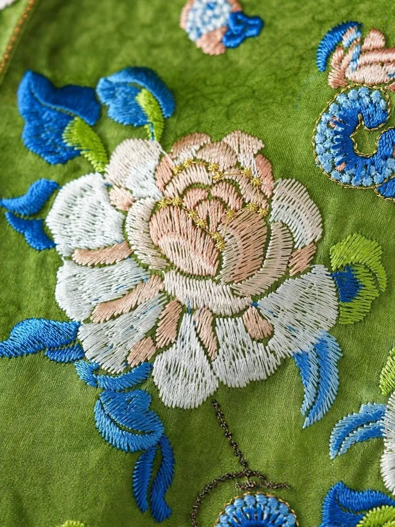 衣都精品- 新款復古醋酸緞面花朵刺繡玉珠盤扣外套
