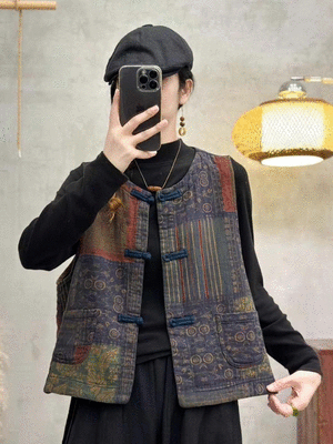 衣都精品- 新款民族風盤扣雙紗做舊馬甲外套