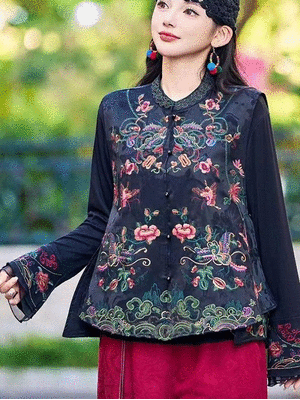 衣都精品- 新款民族風立領刺繡前短後長馬甲上衣