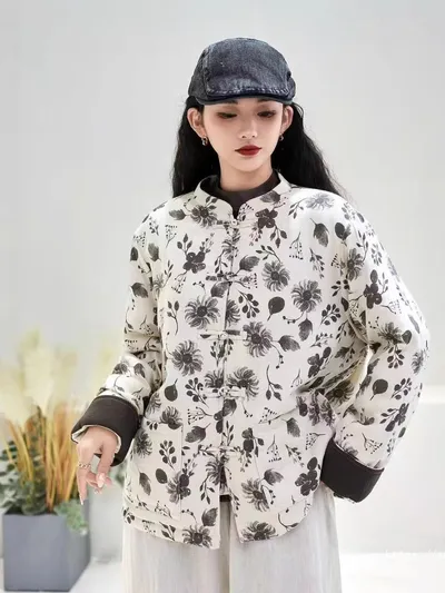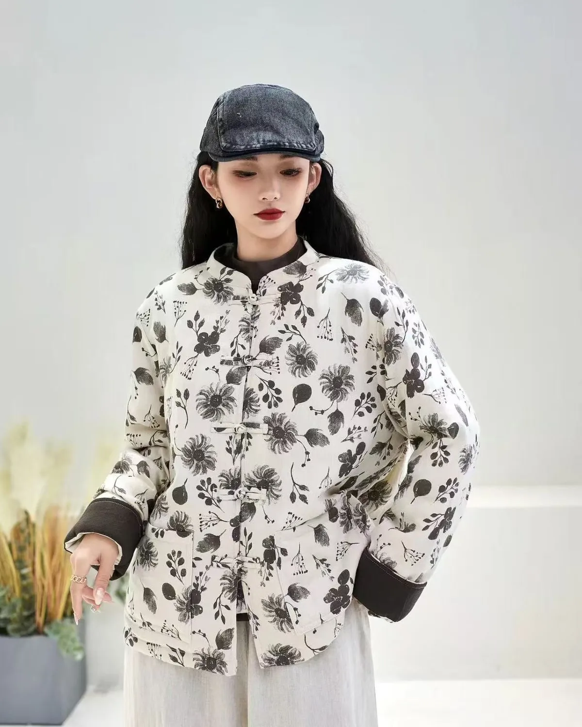 衣都精品- 新款寬鬆盤扣印花雙面穿加棉外套