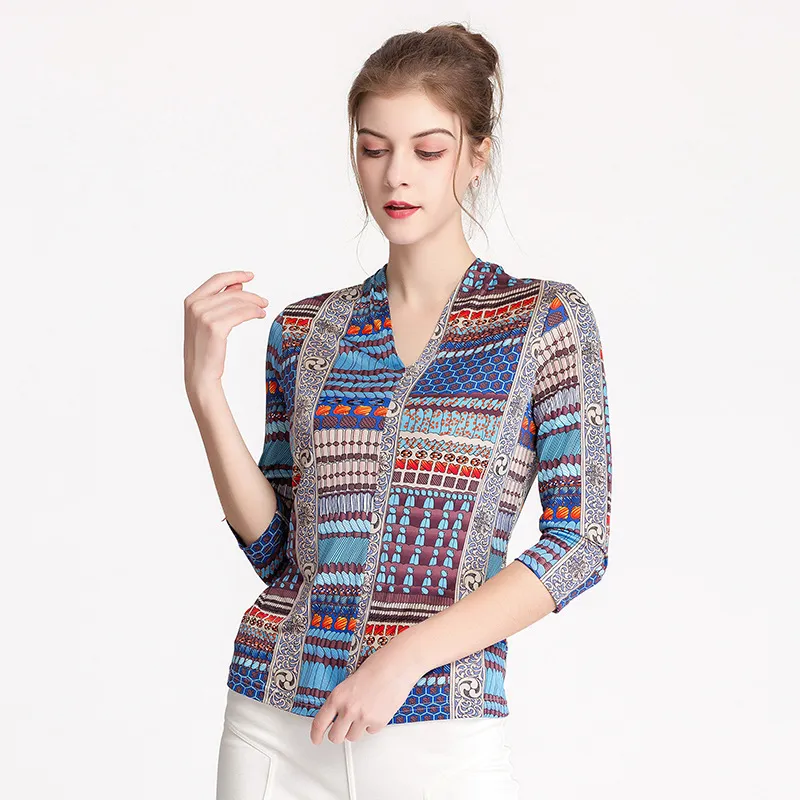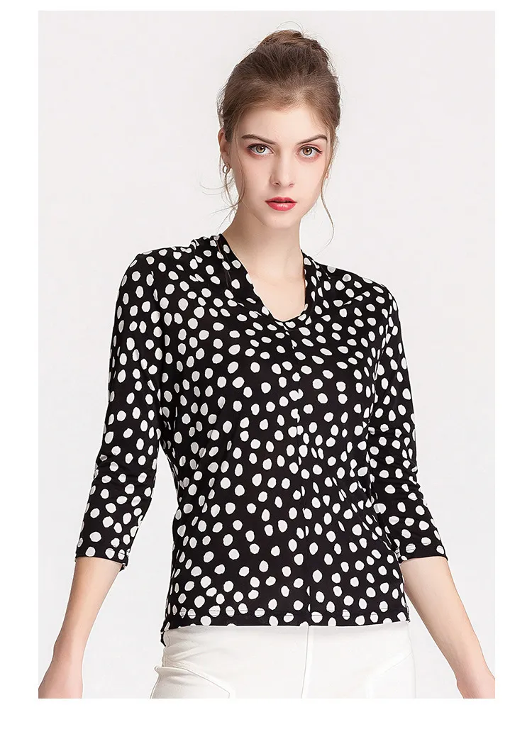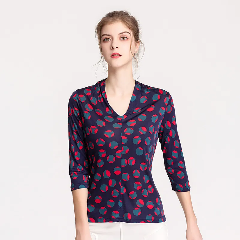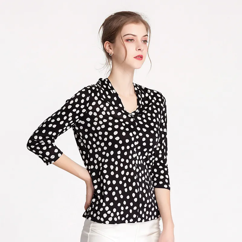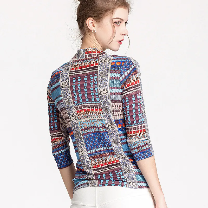 衣都精品- 2021夏季新款桑蠶絲印花半高領中袖上衣