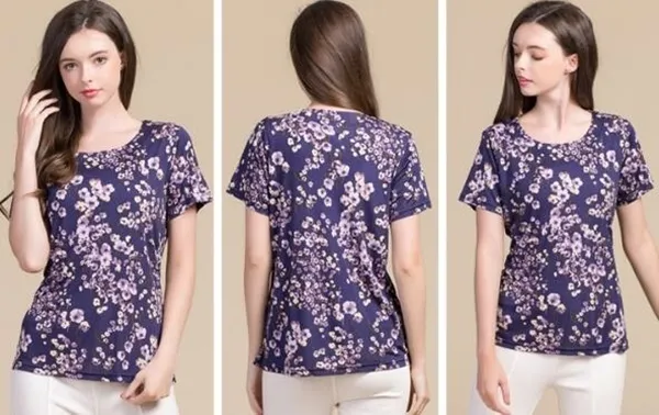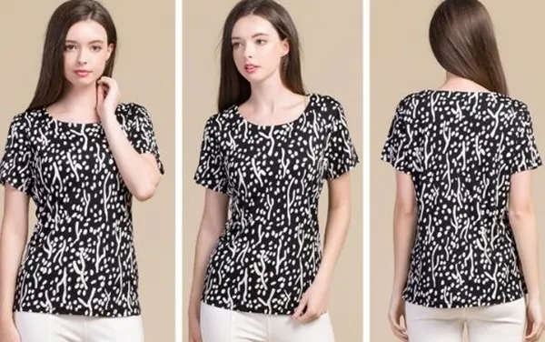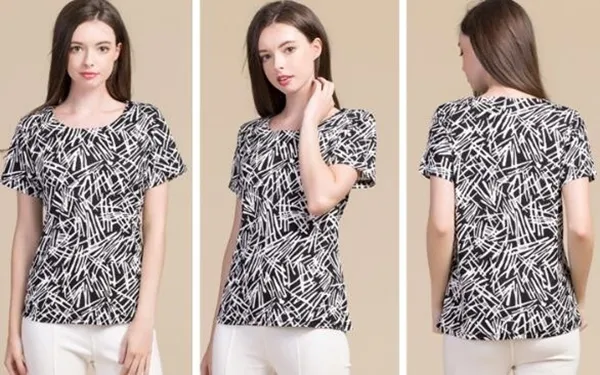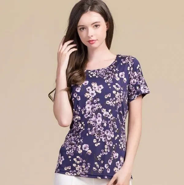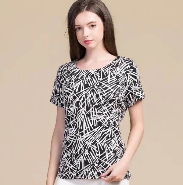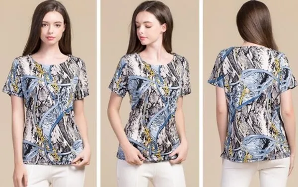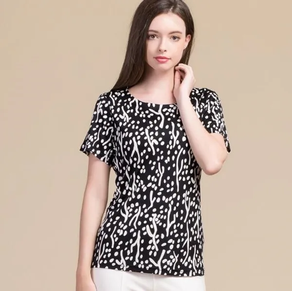 衣都精品-100%桑蠶絲短袖圓領印花修身上衣